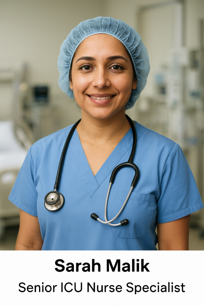 Sarah Malik is an experienced and dedicated Senior ICU Nurse Specialist with over 10 years of clinical expertise in critical care nursing. She has worked in high-pressure environments, handling complex and life-threatening medical situations with confidence, precision, and compassion.